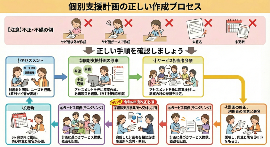 個別支援計画の作成の手順は決められており、間違った手順で作成すると不正とみなされてしまいます。例えば、サビ管以外の職員が作成する、サービス管理者が一人で作成する、個別支援計画を作成したが利用者に署名をもらっていない、個別支援計画の更新がされていないなど作成手順の不正や不備の可能性があるため、どのように個別支援計画を作成していくのかを確認しましょう。