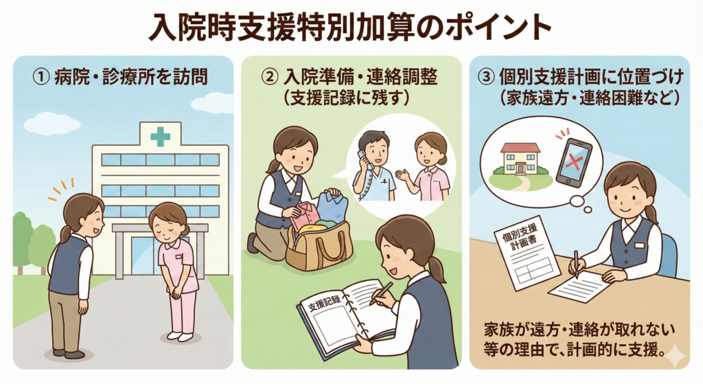 病院又などを概ね週に1回以上訪問し、入院期間中の衣類等の準備や利用者の相談支援など、日常生活上の支援を行うとともに、退院後の円滑な生活移行が可能となるよう、病院と連絡調整を行った場合に算定できる加算です。