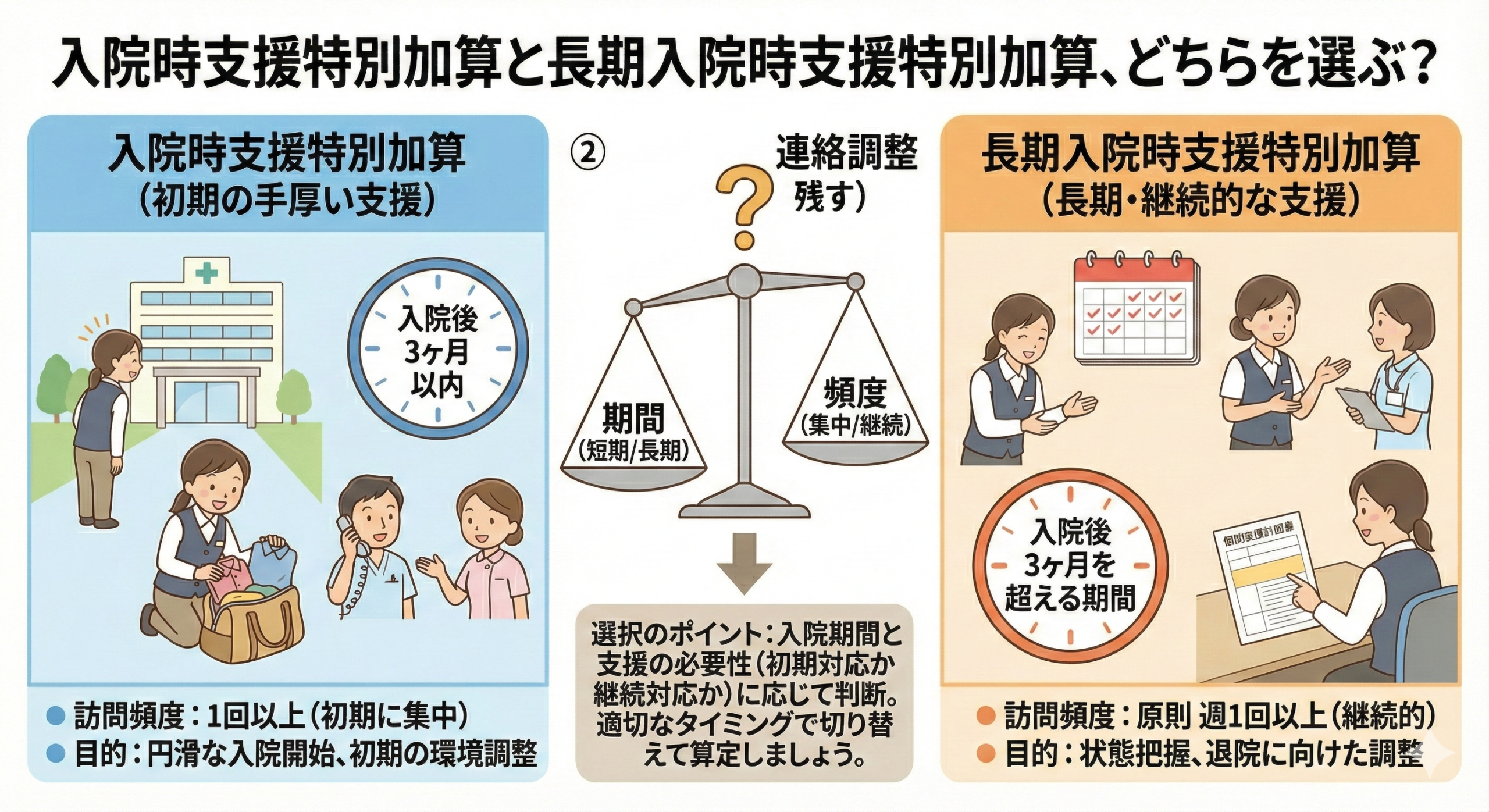 入院時支援特別加算か長期の支援加算か、どちらかを選ぶかは「加算対象期間が9日以内か10日を越えるか」(もしくは12日以内か13日以上か)という点を基準に判断すれば最適に選べることが分かります。ただし、訪問回数など支援時間は考慮する必要があります。