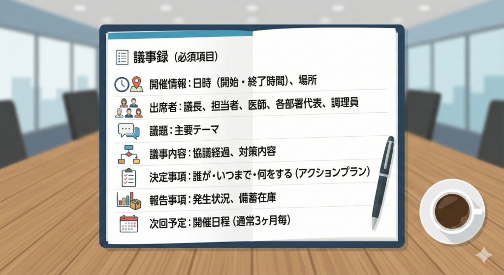 の委員会開催する必要があります。委員会を開催した際は、議事録を作成しその結果を職員に周知徹底することが必要です。