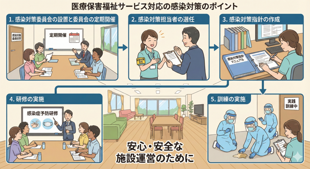 感染症・食中毒の予防及びまん延防止のための指針を作成する必要があります。感染対策の指針は、感染対策委員会が作成します。