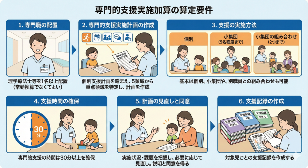 専門的支援実施加算は、理学療法士等により個別・集中的な専門的支援を計画的に行った場合に算定できます。算定要件は下記の通りです。