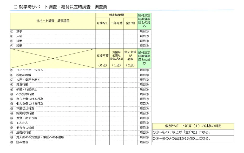 個別サポート加算(Ⅰ)は、著しく重度および行動上の課題のあるケアニーズの高い就学児への支援を充実させる観点から、「就学児サポート調査票」のうち、①から③ のいずれかに該当すると市町村が認めた障がい児について評価される加算です。