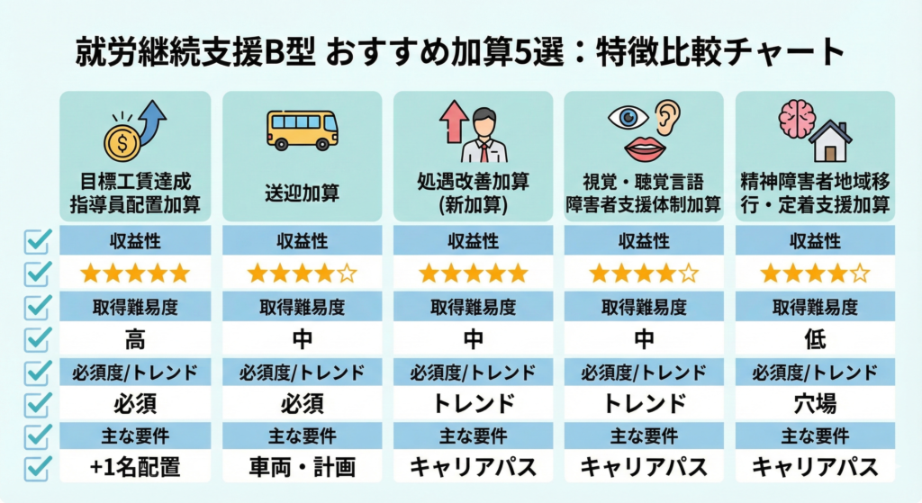 【おすすめ度:★★★★★】 就労Bならではの加算であり、最も優先的に検討すべきものです。
