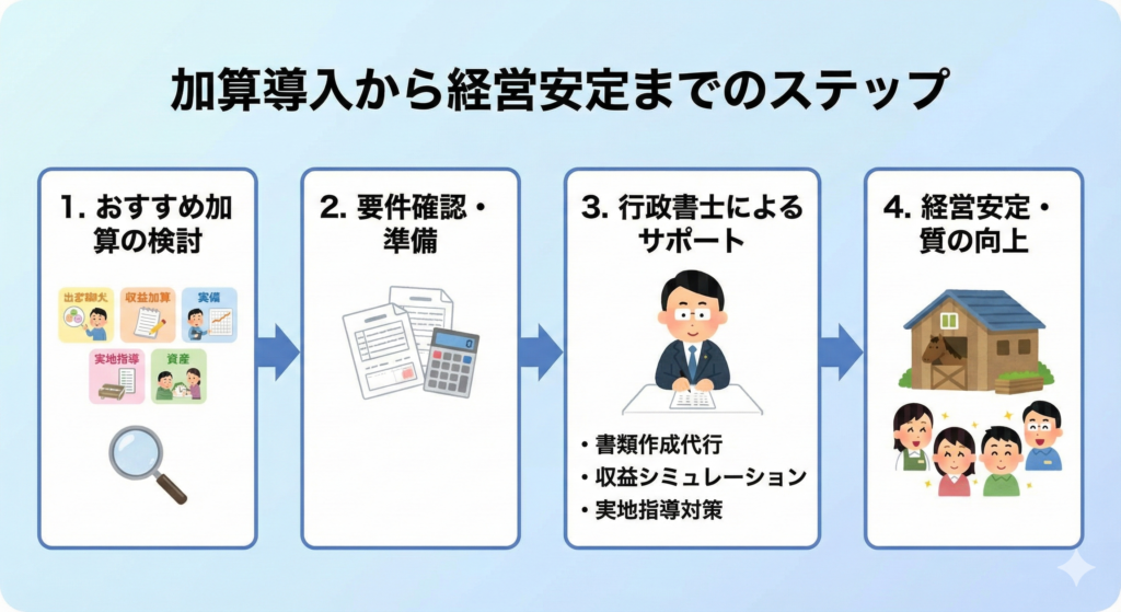 これらの加算を組み合わせることで、経営基盤は格段に安定します。 行政書士として開業後は、これらの複雑な計算や要件チェック、実地指導対策までワンストップでサポートする予定です。