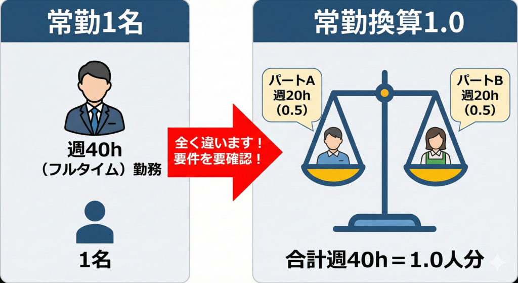 • 常勤換算1.0: 「チーム全員の労働時間を足すと、フルタイム1人分になる」という意味です。 配置基準で「常勤職員を1名以上配置」と書かれている場合は、いくらパートさんを束ねて常勤換算1.0にしても、正社員がいなければ基準違反となります。「人数指定」なのか「換算指定」なのか、要件をよく確認してください
