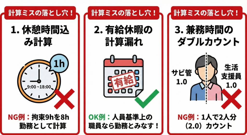 私が監査や審査をしていて、特によく見かける「計算ミスのパターン」を3つ紹介します。これに当てはまっていたら、今すぐシフト表を見直してください。