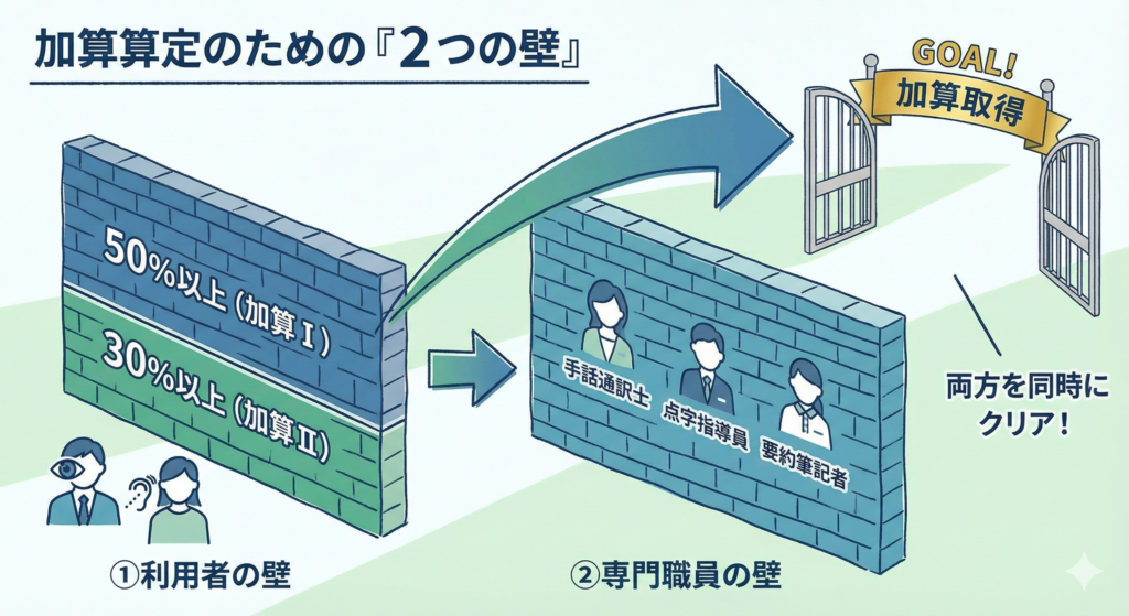 この加算を取得するためには、複雑な要件をクリアする必要があります。 イメージしやすいように、要件を「2つの壁」として整理しました。