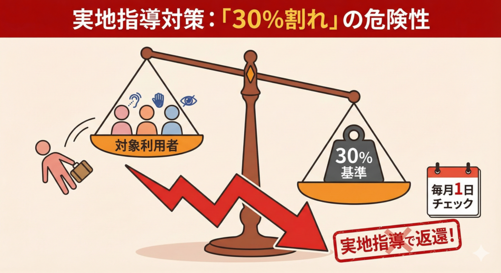 【対策】 毎月1日の時点で、必ず「利用者割合チェックシート」を作成し、記録に残してください。 1%でも下回ったら、その月から加算を取り下げる「変更届」が必要です(※自治体により取り扱いは異なりますが、加算算定をストップする処理は必須です)。